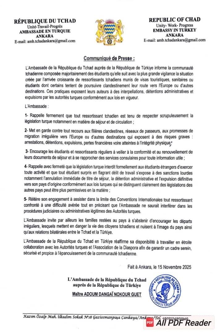 L'Ambassade de la République du Tchad auprès de la République de Türkiye invite la Diaspora tchadienne vivant sur le sol turc , à se conformer à la législation turque en matière de séjour et de circulation. Lire le communiqué